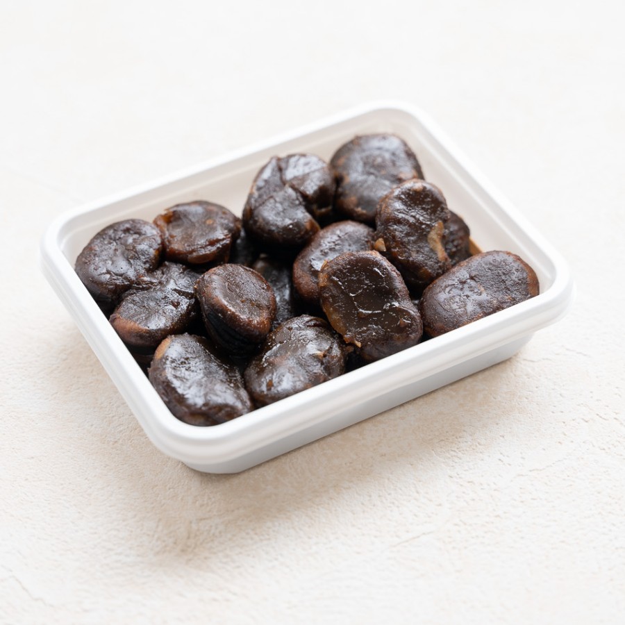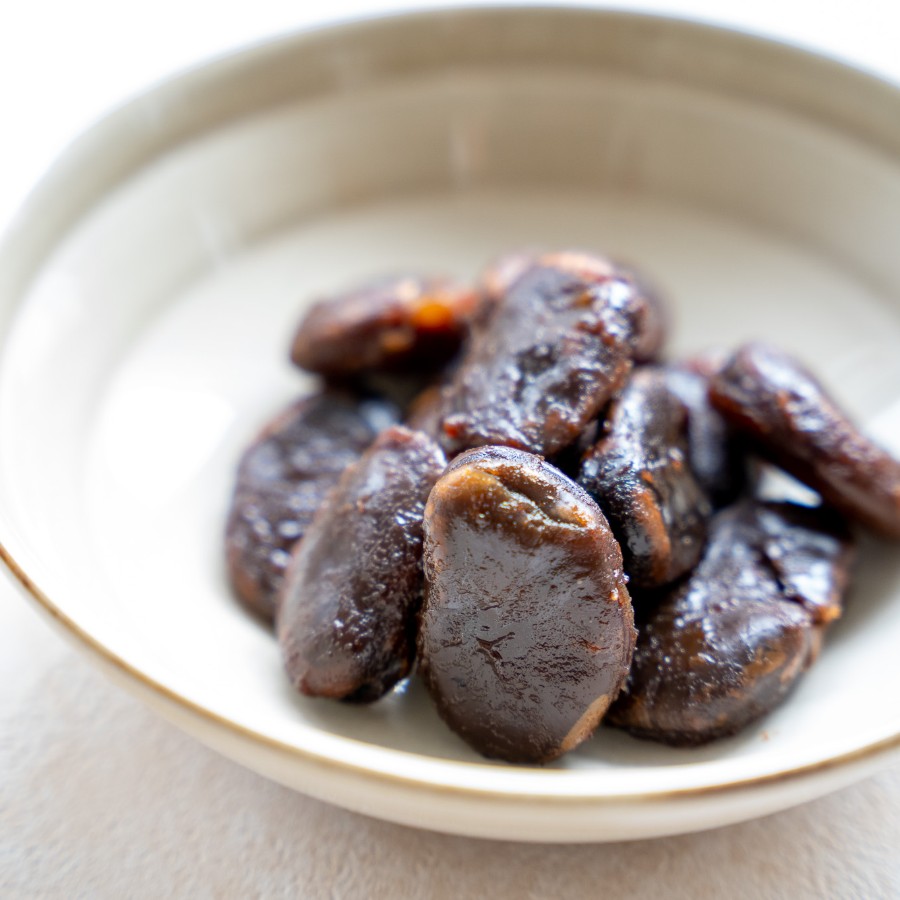 お多福豆とは、大粒のそら豆を甘く煮込んだ料理のこと。職人がじっくり丁寧に煮込むことで、肉厚でやわらかい食感と真っ黒な見た目を実現しています。